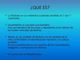 La Wiphala es un emblema cuadrado dividido en 49 cuadrados de colores que representa a los pueblos indígenas de los Andes centrales de Bolivia. Originalmente fue una bandera inca y ahora es un símbolo nacional de Bolivia que representa la identidad cultural indígena. El Festival de la Wiphala celebra los derechos humanos de los pueblos indígenas y busca reconocer todos los aspectos de la vida humana.