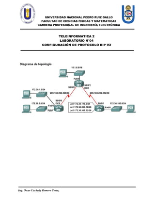 Este documento describe un laboratorio de configuración de protocolo RIP v2. Se realizó el laboratorio número 04 sobre configuración de protocolo RIP v2 para interconectar redes.