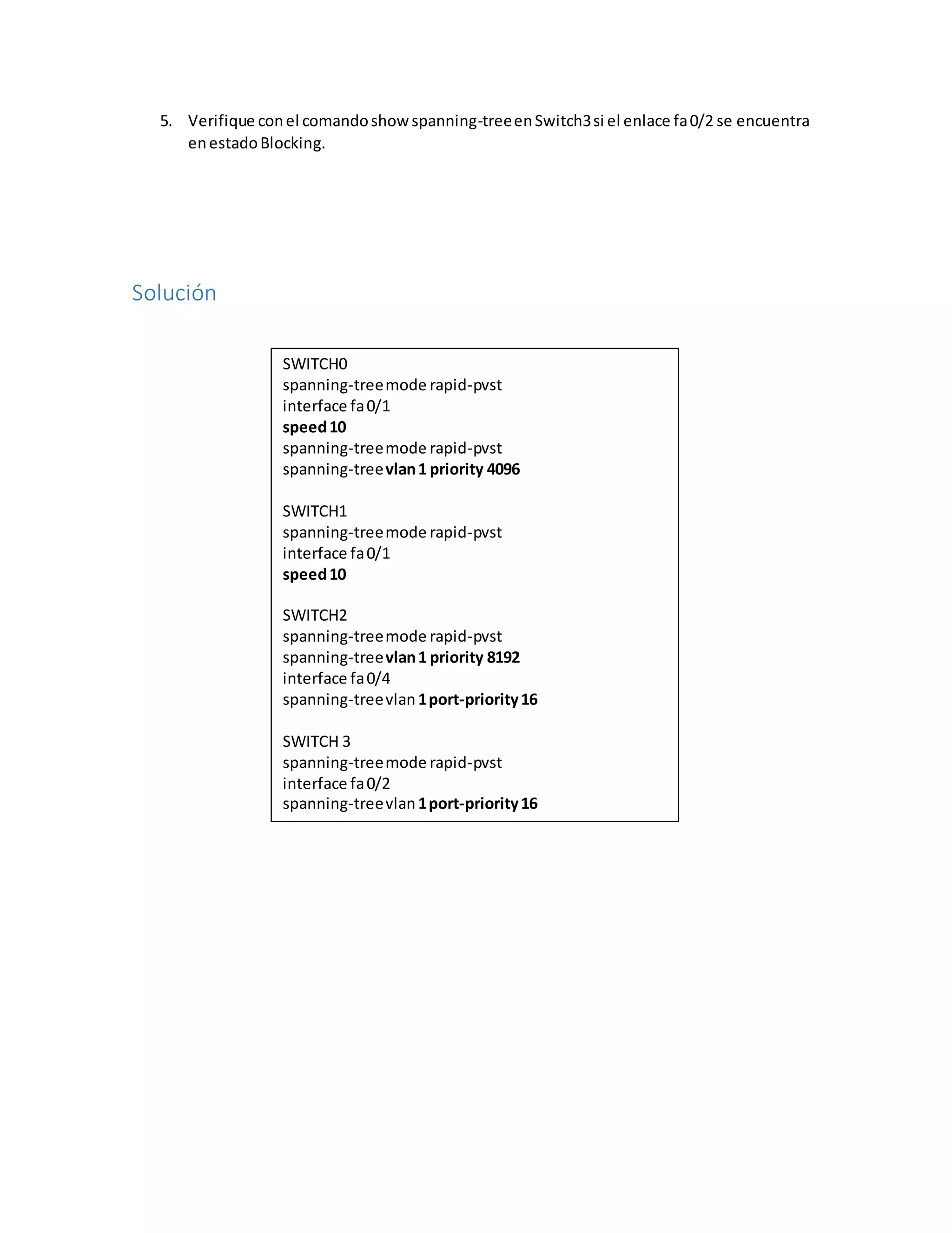 El documento describe un laboratorio de configuración de VLANs y RSTP. Los objetivos son configurar Switch0 como el root bridge, y configurar los enlaces fa0/1 de Switch1 y fa0/2 de Switch3 en estado blocking. Las instrucciones indican descargar un archivo, configurar todos los switches para usar Rapid PVST, establecer prioridades en Switch0, Switch2 y los puertos de Switch1 y Switch3, y verificar el estado spanning tree.
