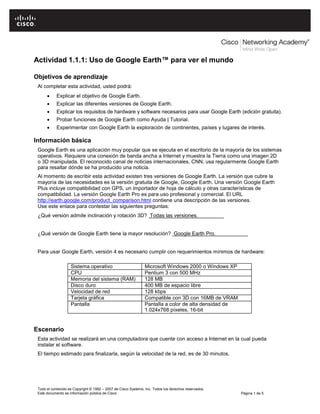 Este documento presenta una actividad para que los estudiantes exploren el programa Google Earth. Explica que Google Earth permite a los usuarios ver imágenes de satélite de la Tierra. Describe las diferentes versiones de Google Earth y los requisitos técnicos para ejecutarlo. La actividad guía a los estudiantes a través de varias tareas como navegar la interfaz, buscar ubicaciones y reflexionar sobre cómo las redes digitales permiten que Google Earth funcione.