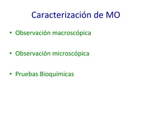 Este documento describe una serie de pruebas bioquímicas para caracterizar microorganismos (MO), incluyendo pruebas relacionadas con la respiración celular, fuente de carbono, compuestos nitrogenados, y pruebas IMViC para diferenciar bacterias entéricas. Explica procedimientos como la prueba de la catalasa, agar hierro de Kliger, ureasa, indol, rojo metilo, Voges Proskauer y citrato.