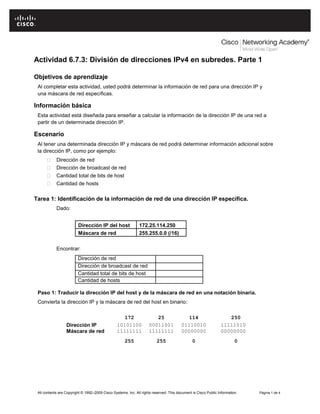 Este documento presenta una actividad para enseñar a los estudiantes cómo determinar la información de red a partir de una dirección IP y máscara de red específicas. Proporciona ejemplos de cómo calcular la dirección de red, la dirección de broadcast, la cantidad de bits de host y la cantidad de hosts disponibles. Luego, desafía a los estudiantes a completar esta tarea para varias direcciones IP y máscaras de red.