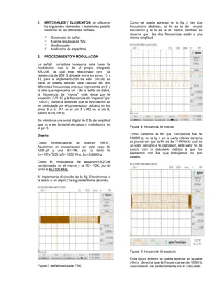 Este documento describe un laboratorio sobre modulación FSK utilizando el circuito integrado XR2206. Se modula una señal digital binaria con dos frecuencias distintas para representar un 1 lógico y un 0 lógico. Se calculan las frecuencias de marca y espacio y se observa la señal modulada en el osciloscopio para verificar que coincide con lo calculado. Adicionalmente, se nota que al variar el potenciómetro, la modulación puede cambiar a ASK si la resistencia es baja o mantenerse como F