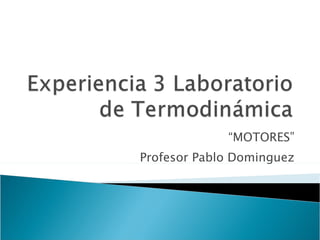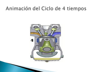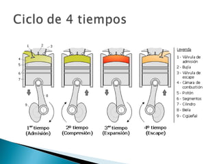 El documento describe el funcionamiento y características de los motores de combustión interna, en particular los motores de cuatro tiempos. Explica que estos motores transforman la energía química de la combustión de una mezcla de aire y combustible en energía mecánica a través de cuatro tiempos o fases: admisión, compresión, explosión y escape. También destaca que este tipo de motor es más eficiente que otros como el motor de vapor y se ha convertido en el mecanismo predominante para aplicaciones que requieren cambios frecuentes de energ