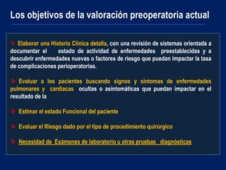 El documento proporciona una guía sobre los exámenes prequirúrgicos. Resalta la importancia de realizar una historia clínica detallada para identificar enfermedades preexistentes o nuevos factores de riesgo. También es necesario evaluar signos y síntomas de enfermedades pulmonares y cardiacas ocultas, estimar el estado funcional del paciente, y determinar el riesgo según el procedimiento quirúrgico. Se deben revisar los medicamentos que toma el paciente e implementar recomendaciones para reducir ries