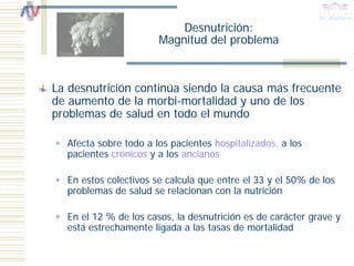 Este documento describe la importancia de la evaluación del estado nutricional en pacientes hospitalizados, crónicos y ancianos. La desnutrición es un problema común en estos grupos y se asocia con un aumento de la morbilidad y mortalidad. La evaluación del estado nutricional mediante parámetros clínicos, antropométricos y de laboratorio permite detectar deficiencias nutricionales de forma temprana y mejorar los resultados del tratamiento.