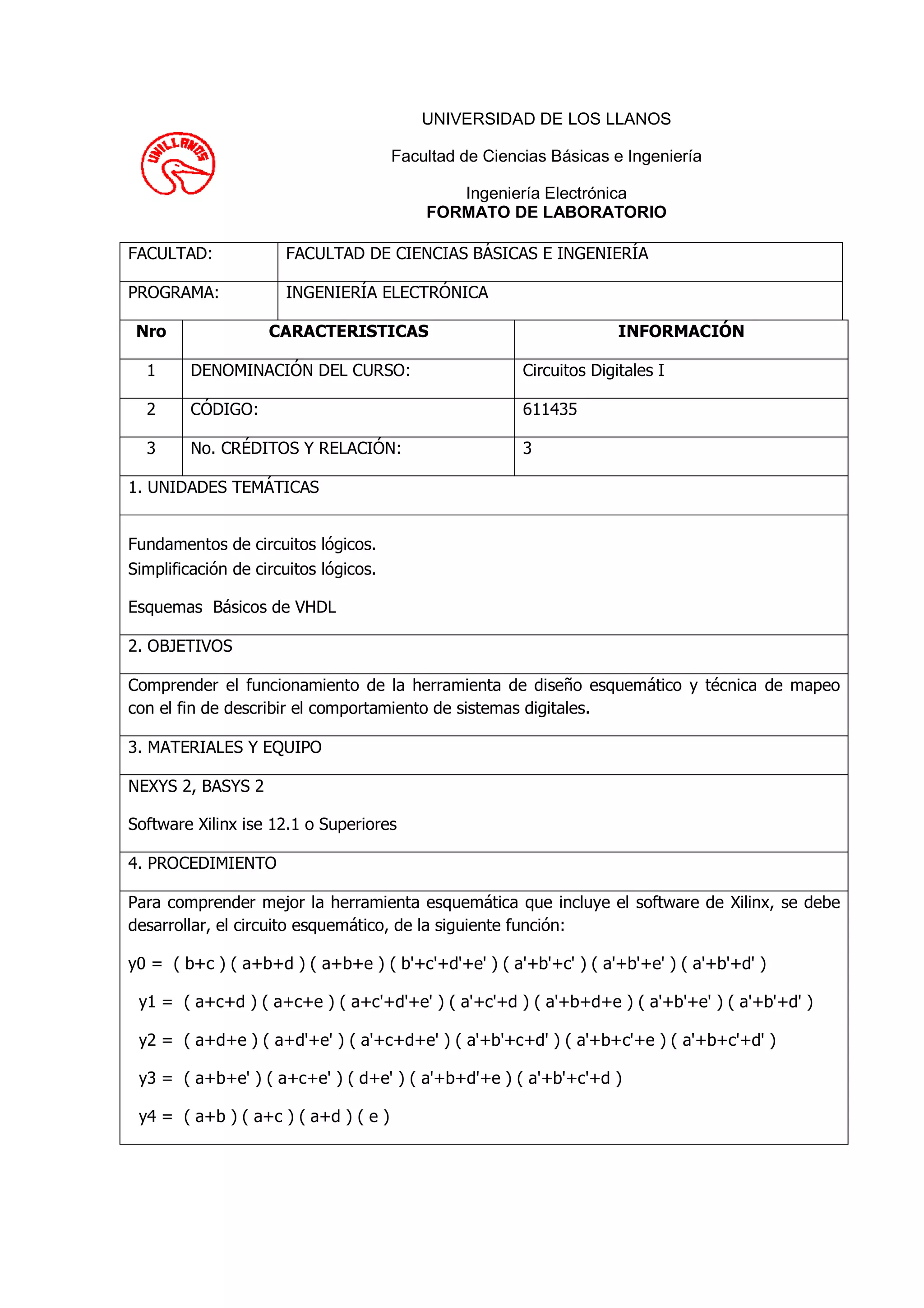 Este documento presenta el formato de laboratorio para el curso Circuitos Digitales I de Ingeniería Electrónica. Los estudiantes aprenderán a usar herramientas de diseño esquemático como Xilinx para describir el comportamiento de sistemas digitales. Deberán desarrollar un circuito que implemente ciertas funciones lógicas usando compuertas básicas y verificarlo generando trenes de pulsos. También deberán mapear la función a puertos usando VHDL. El trabajo deberá entregarse antes del 4 de mar