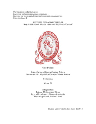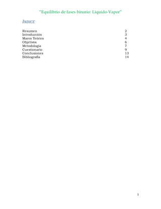 El documento presenta el reporte de laboratorio de un experimento sobre el equilibrio de fases binario entre la acetona y el cloroformo. El objetivo fue analizar este equilibrio a presión constante y comparar los resultados con la teoría. Se realizaron varias mezclas de estos componentes y se midieron propiedades como la densidad. Luego, se calcularon las fracciones molares y se construyó un diagrama de composición vs temperatura. Finalmente, se comparó el diagrama experimental con el teórico, encontrando un buen acuerdo general entre