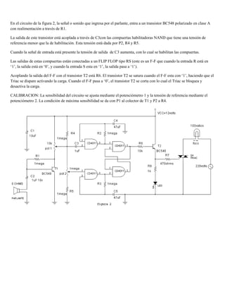 Este documento describe dos circuitos que utilizan tiristores para controlar la potencia en una carga. El primer circuito usa un DIAC y un capacitor para retardar la fase y disparar un triac, variando así la potencia entregada a una lámpara. El segundo circuito usa un transistor, compuertas NAND, un flip-flop y un triac para encender y apagar una carga en respuesta a una señal de entrada proveniente de un parlante. Ambos circuitos permiten controlar la potencia de manera variable mediante el uso de potenciómetros.
