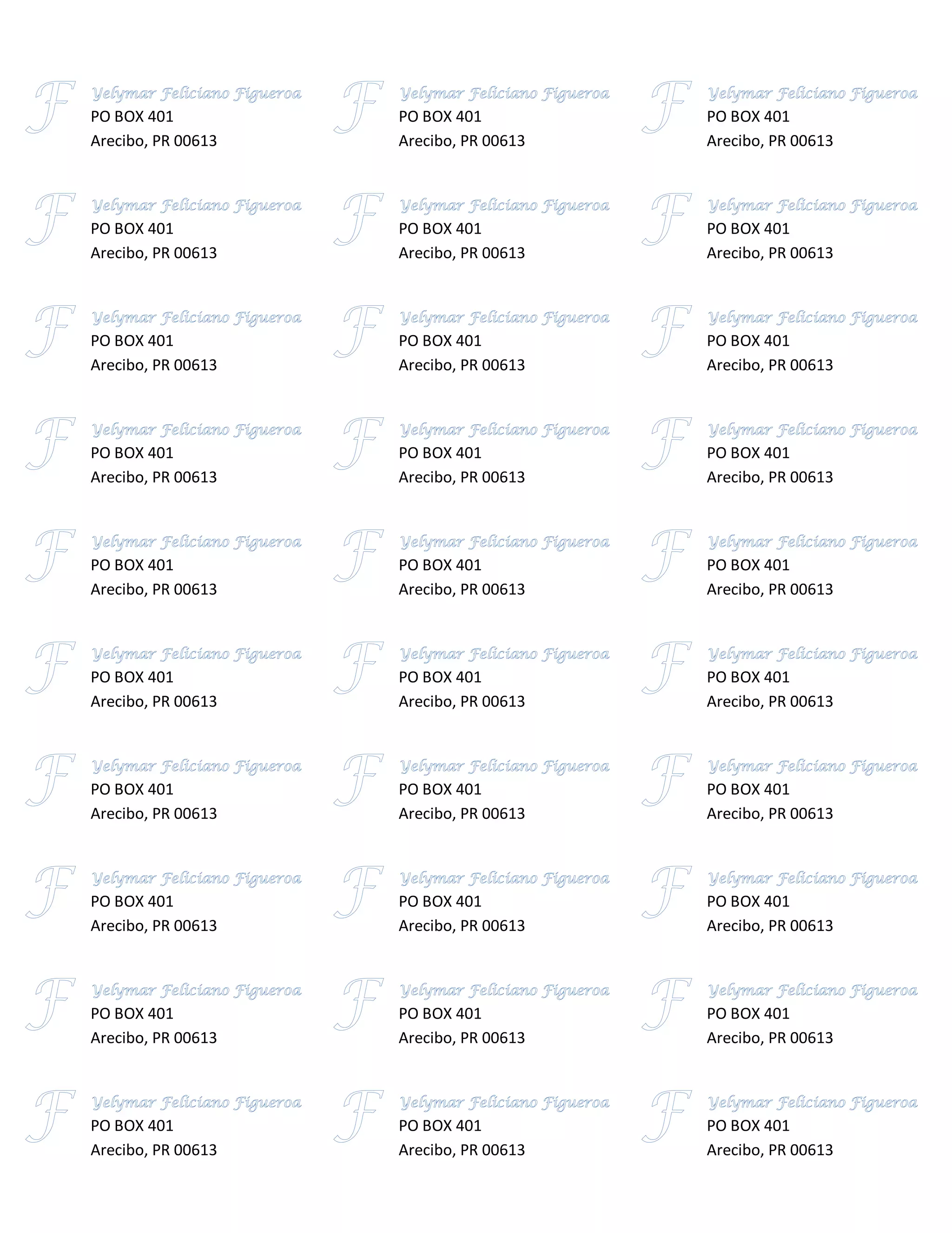 El documento repite la misma dirección de correo postal (PO BOX 401, Arecibo, PR 00613) nueve veces en filas, proporcionando poca información adicional más allá de la dirección repetida.