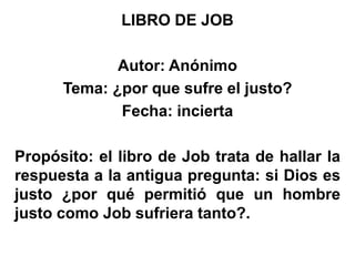 El libro de Job, de autor anónimo, explora la pregunta de por qué sufren los justos a través de la historia de Job, un hombre temeroso de Dios que es probado por Satanás a lo largo de una serie de calamidades. A lo largo del texto, se presentan discusiones sobre la naturaleza del sufrimiento, la fe y la comprensión divina, resaltando que la verdadera confianza en Dios no depende de las circunstancias. Finalmente, Job es restaurado tras reconocer su ignorancia ante la magnitud de lo divino y orar por sus amigos, lo que evidencia la compasión y justicia de Dios hacia su siervo justo.