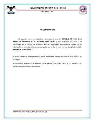 Este documento presenta el informe de laboratorio sobre el estudio del flujo a través de orificios bajo batiente constante. Explica el marco conceptual, el procedimiento experimental que incluye la recopilación de información, ensamblado del equipo y procedimiento de la práctica, los cálculos y resultados, y las conclusiones sobre cómo depende el coeficiente de descarga del área del orificio. También incluye observaciones como la necesidad de evitar aire en las mediciones.