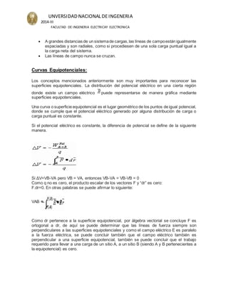 El documento describe un experimento para determinar curvas equipotenciales y líneas de campo eléctrico para tres configuraciones de carga distintas. Se explican conceptos teóricos como campo eléctrico, líneas de campo y curvas equipotenciales. Luego, el procedimiento experimental involucra medir puntos de igual potencial en una solución de sulfato de cobre usando electrodos y un galvanómetro para graficar las curvas equipotenciales de cada configuración. Finalmente, los resultados muestran tablas de datos, gráficas y