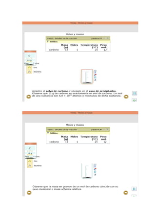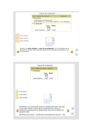 El documento presenta un estudio sobre el equilibrio químico, sus reacciones y factores que influyen en él, como temperatura, presión y concentración. A través de varias actividades interactivas, se exploran conceptos como las reacciones reversibles, la masa molar, y el cálculo del rendimiento de reacciones químicas. Se busca ampliar el conocimiento en procesos químicos y sus respectivas dinámicas para una mejor comprensión en el ámbito de la química.