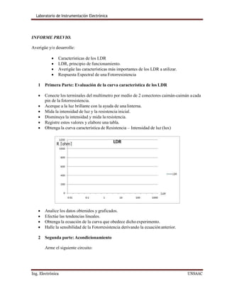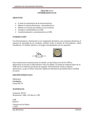 Este documento presenta los objetivos y procedimientos de un experimento sobre fotorresistencias. Los objetivos incluyen evaluar la característica de resistencia vs intensidad de luz de las fotorresistencias, obtener su ecuación y estudiar su sensibilidad. El experimento involucra medir estas variables bajo diferentes niveles de iluminación y graficar los resultados para derivar las ecuaciones que describen el comportamiento de las fotorresistencias. También incluye el armado de un circuito de acondicionamiento con un LDR para analizar su tensión y resist