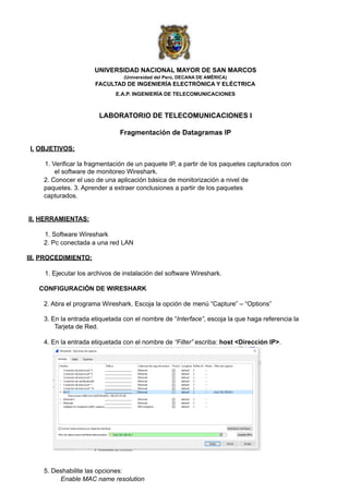 Este documento describe un experimento de laboratorio para verificar la fragmentación de datagramas IP utilizando las herramientas Wireshark y ping. El objetivo es observar cómo un mensaje ICMP de gran tamaño es fragmentado en varios paquetes Ethernet a través del análisis del tráfico de red capturado. El documento explica los pasos para configurar Wireshark, ejecutar ping con diferentes tamaños de mensaje, y analizar los resultados para determinar el número y tamaño de las fragmentaciones.