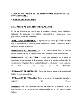 Este documento resume los cambios más importantes introducidos por la nueva Ley Orgánica del Trabajo, entre los que se incluyen: 1) nuevas definiciones como trabajador dependiente, independiente, de dirección e inspección; 2) cambios en los contratos por tiempo determinado; 3) nuevas causales de suspensión laboral; 4) modificaciones al régimen de prestaciones sociales; 5) establecimiento de la estabilidad laboral; y 6) precisiones sobre el concepto de salario.