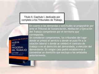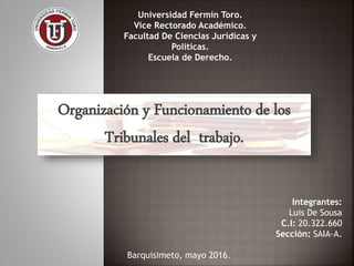 El documento describe la organización y funcionamiento de los tribunales del trabajo en Venezuela. Explica que existen tribunales de primera instancia conformados por un juez y secretario para mediar demandas laborales. También existen tribunales superiores de tres jueces y secretario para casos de apelación, y el Tribunal Supremo de Justicia en materia laboral puede revisar decisiones mediante recursos de casación.