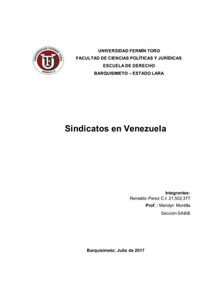 Este documento describe los requisitos para la constitución y registro de un sindicato en Venezuela de acuerdo con la Ley Orgánica del Trabajo. Explica las cláusulas típicas de una convención colectiva de trabajo y los requisitos para lograr una. Distingue entre una convención colectiva de trabajo y un acuerdo colectivo de trabajo. Finalmente, discute la importancia de los sindicatos, la libertad sindical y la estabilidad laboral.