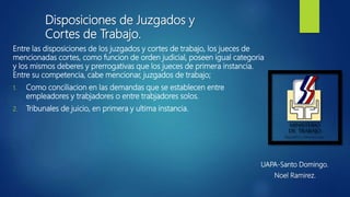 Este documento describe la composición y funciones de los juzgados y cortes de trabajo en la República Dominicana. Explica que los juzgados de trabajo existen en varias provincias y que se encargan de la conciliación laboral y de juzgar casos en primera instancia, mientras que las cortes de trabajo solo operan en siete provincias y conocen apelaciones y otros asuntos en última instancia.