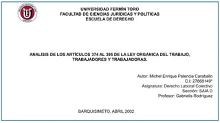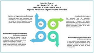 El documento analiza los artículos 374 al 395 de la Ley Orgánica del Trabajo, que regulan el registro y constitución de organizaciones sindicales en Venezuela. Se detallan los requisitos y procedimientos para el registro de sindicatos, así como los derechos y obligaciones de sus afiliados y directivos. También se enfatiza la importancia de elecciones democráticas y participación en la gestión sindical y en la negociación colectiva.