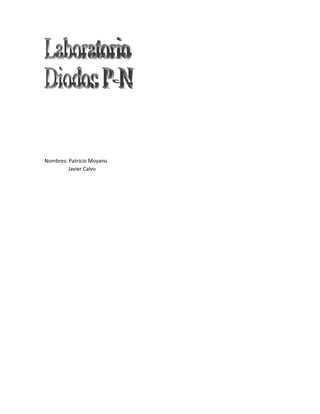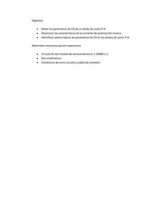 Este documento describe un experimento para medir los parámetros de una unión PN en un diodo. Los objetivos son medir la corriente de polarización directa e inversa y los valores típicos de parámetros como la tensión de ruptura. Se explican los pasos para conectar el diodo en polarización directa y medir la corriente, y en polarización inversa para medir la corriente de fuga. Las mediciones se registran en tablas y se analizan las características de la corriente en ambas polarizaciones.