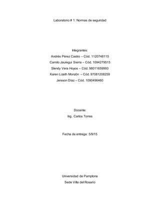 Este documento presenta las normas de seguridad para el laboratorio de química. Describe las medidas de seguridad que deben seguir los estudiantes al ingresar y trabajar en el laboratorio, como usar batas de laboratorio, gafas y ropa adecuada. También explica procedimientos seguros para el uso de sustancias químicas, mechas y otros equipos de laboratorio, así como los pasos a seguir en caso de un accidente. El objetivo es asegurar la seguridad de todos los estudiantes durante las prácticas de laboratorio.