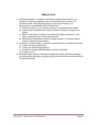 Este documento describe un informe de laboratorio para un curso de aplicaciones de matemática. El informe incluye tres preguntas que involucran la programación de un prototipo educativo en C para modelar cónicas (parábolas, elipses, circunferencias e hipérbolas) en un plano cartesiano. La primera pregunta implica graficar puntos y polígonos ingresados por el usuario. La segunda pregunta implica graficar polígonos de lados variables. La tercera pregunta implica graficar cónicas ingresando sus ecu