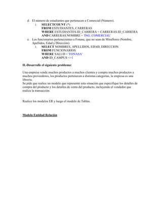 Este documento presenta un modelo de sistema de información para una librería. Incluye consultas SQL para una base de datos sobre libros, editoriales, préstamos y empleados. También propone un modelo entidad-relación y tablas para representar los productos, proveedores, clientes, ventas y categorías de la librería.