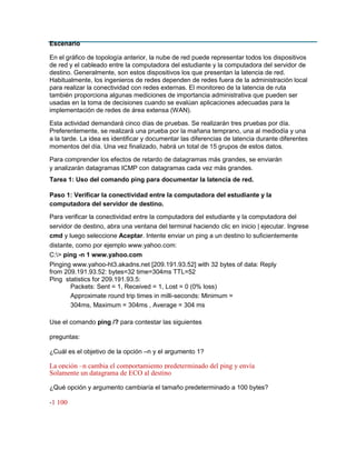 Este documento describe cómo usar el comando ping para medir y documentar la latencia de red. Los estudiantes usarán ping para enviar paquetes a un destino remoto y medir el retorno durante diferentes momentos del día. Luego, usarán Microsoft Excel para calcular estadísticas como el retardo promedio, medio y de modo a partir de los resultados de ping. Finalmente, analizarán cómo aumenta el retardo a medida que crece el tamaño del paquete ICMP.
