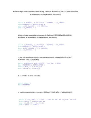 Este documento contiene un laboratorio para una asignatura sobre bases de datos. Incluye consultas SQL para obtener diferentes tipos de datos de los estudiantes, libros y préstamos de una universidad, así como instrucciones para crear vistas que almacenen los datos de forma permanente. También solicita obtener estadísticas como el número de estudiantes por carrera, campus y ciudad, y el número de préstamos atrasados y activos.