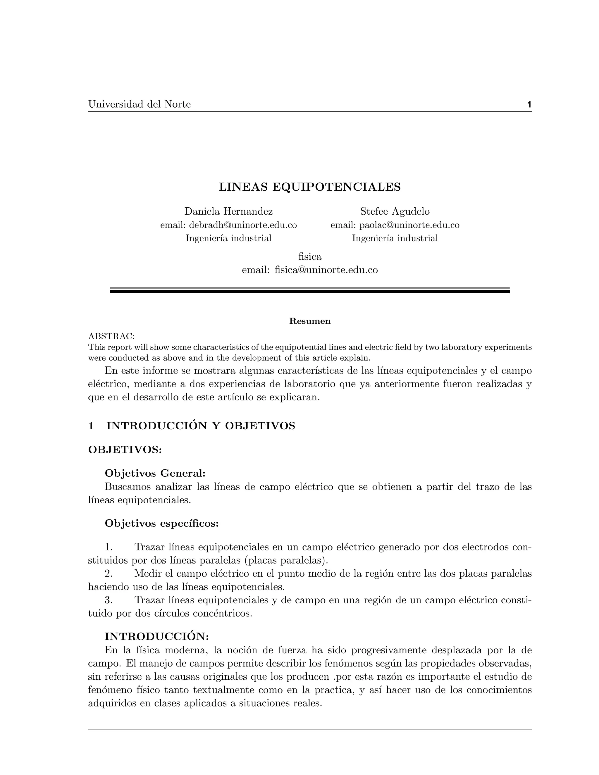 Este documento describe dos experimentos de laboratorio para trazar líneas equipotenciales y de campo eléctrico. En el primer experimento, se trazaron líneas equipotenciales para dos cargas puntuales y se observó que las líneas de campo forman una curva elíptica. En el segundo experimento, se trazaron líneas equipotenciales y de campo entre dos placas paralelas, observando que el campo eléctrico es perpendicular a las líneas equipotenciales y paralelo a las placas. El documento analiza los resultados de ambos