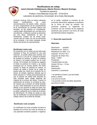 El documento describe los tipos de rectificadores de voltaje, incluyendo rectificadores de media onda y onda completa. Explica que los rectificadores convierten la corriente alterna de la red eléctrica en corriente continua utilizando diodos. También describe cómo se construyen y funcionan los diferentes tipos de rectificadores y cómo se pueden clasificar. Finalmente, resume los resultados de un experimento para analizar el funcionamiento de un rectificador de media onda y medir las características de su salida.