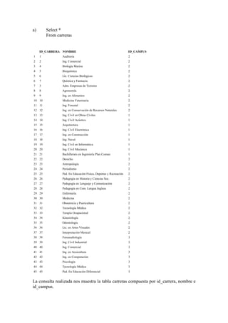 Este documento presenta el resultado de 4 consultas SQL realizadas sobre la tabla "carreras" de una base de datos. La primera consulta muestra todos los registros de la tabla. La segunda consulta cuenta el número total de registros. La tercera consulta muestra los registros donde el id_carrera es mayor a 3. Y la cuarta consulta muestra los registros donde el id_carrera es distinto de 3.