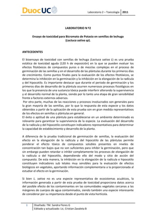El documento describe un ensayo de toxicidad para evaluar los efectos fitotóxicos del bicromato de potasio (K2CrO4) en semillas de lechuga (Lactuca sativa) mediante la cuantificación de la inhibición en la germinación y elongación de la radícula y el hipocotilo. El ensayo involucra la preparación de soluciones de K2CrO4 a diferentes concentraciones y la incubación de las semillas expuestas durante 120 horas para medir los efectos en el desarrollo de las plántulas. El objetivo