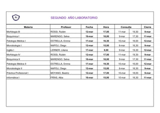 El documento presenta los horarios de consultas y cierres de diferentes materias para el segundo y tercer año de laboratorio. En el segundo año se incluyen las materias de Morfología III y IV, Bioquímica I y II, Patología Médica I y II, Microbiología I y II, Inglés I, Práctica Profesional I e Informática I junto con los datos del profesor, fecha, hora de consulta y cierre. En el tercer año se presentan similares datos para materias como Bioquímica III y IV, Bioest