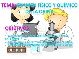 El documento describe los procedimientos y análisis de una prueba de orina, incluyendo el uso de tiras reactivas para medir pH, glucosa y otros componentes. Explica que las pruebas de orina pueden ayudar a diagnosticar problemas renales y del tracto urinario al identificar signos de infección, sangre u otros hallazgos anormales. También enfatiza la importancia de seguir protocolos de seguridad durante las pruebas de orina.