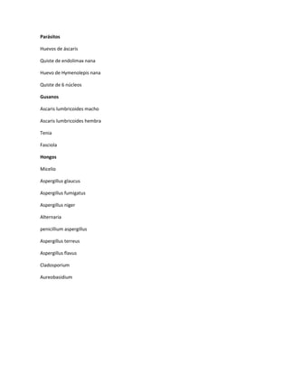 El documento lista diferentes tipos de parásitos, gusanos, hongos y sus características morfológicas. Incluye huevos, quistes y formas adultas de áscaris, tenia y otros parásitos, así como varios géneros de hongos como Aspergillus, Penicillium, Cladosporium y sus características microscópicas como micelio.