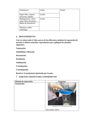 Este documento presenta un informe de laboratorio sobre los métodos de separación de mezclas. Describe 7 métodos comunes (tamización, filtración, decantación, destilación, sublimación, cristalización y centrifugación) e incluye ilustraciones y ejemplos de cada uno. También contiene preguntas sobre los fundamentos y aplicaciones de los diferentes métodos para separar mezclas homogéneas y heterogéneas.