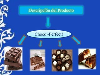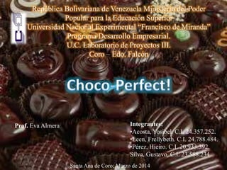 Este documento describe un proyecto de negocio para la producción y venta de chocolate artesanal llamado "Choco-Perfect". Incluye un análisis de la demanda histórica y proyectada hasta 2018, un resumen de los precios que los consumidores estarían dispuestos a pagar, y una descripción de los canales de distribución, incluyendo ventas directas, ventas a minoristas y ventas a mayoristas. El proyecto fue desarrollado por un grupo de estudiantes como parte de un curso de desarrollo empresarial.
