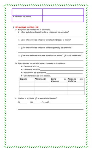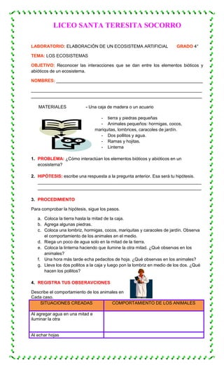 El documento presenta un laboratorio sobre la elaboración de un ecosistema artificial para estudiantes de 4to grado. El objetivo es reconocer las interacciones entre elementos bióticos y abióticos. Se instruye a los estudiantes a colocar tierra, piedras, animales pequeños, agua y plantas en una caja para observar su comportamiento cuando se modifican factores como la iluminación y la disponibilidad de alimentos y agua. Los estudiantes deben registrar sus observaciones y concluir cómo interactúan los diferentes componentes del ecosistema