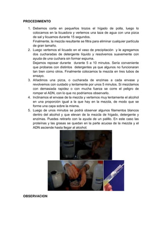 Este documento describe un procedimiento para extraer ADN casero utilizando materiales como hígado de pollo, licuadora, sal, detergente líquido y enzimas (jugo de piña). El procedimiento implica licuar el hígado de pollo, agregar detergente y enzimas, y luego agregar lentamente alcohol, lo que permite que el ADN ascienda hasta la parte superior para ser observado.