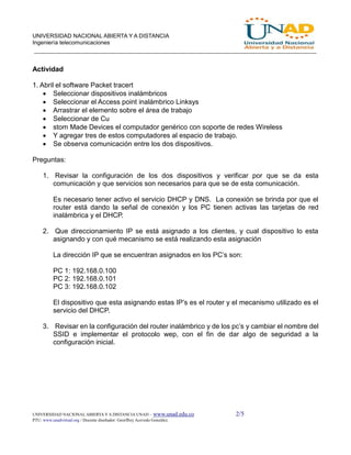 Este documento presenta un laboratorio sobre ingeniería de telecomunicaciones realizado por Ingrid Lorena Guerrero Mayorga. El laboratorio involucra la configuración de una red inalámbrica doméstica utilizando un router Linksys y tres computadores. Se explica que el router asigna direcciones IP a los computadores a través de DHCP y permite la comunicación entre los dispositivos. Posteriormente, se cambia el nombre de la red inalámbrica y se implementa el protocolo WEP para agregar seguridad a la configuración.
