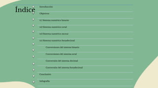 Este documento explica los diferentes sistemas numéricos utilizados en informática, incluyendo el binario, octal, decimal y hexadecimal. Detalla las reglas y símbolos de cada sistema, y cómo realizar conversiones entre ellos, como convertir de binario a decimal agrupando bits o de decimal a hexadecimal mediante divisiones sucesivas. El objetivo es analizar y comprender estos sistemas numéricos y sus conversiones, fundamentales en el desarrollo de software.