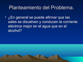 Planteamiento del Problema.Planteamientodel Problema. • ¿En general se puede afirmar que las sales se disuelven y conducen la corriente eléctrica mejor en el agua que en el alcohol?