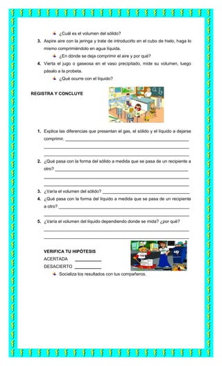 Este documento presenta un experimento de laboratorio para estudiantes de 5to grado sobre las propiedades y características de los estados de la materia (sólidos, líquidos y gases). El objetivo es comprobar propiedades como la compresibilidad y el volumen de las moléculas en cada estado. Los estudiantes realizarán una serie de pasos experimentales utilizando materiales como hielo, agua, aire y plastilina para observar cómo se comportan los diferentes estados y luego registrarán sus conclusiones.
