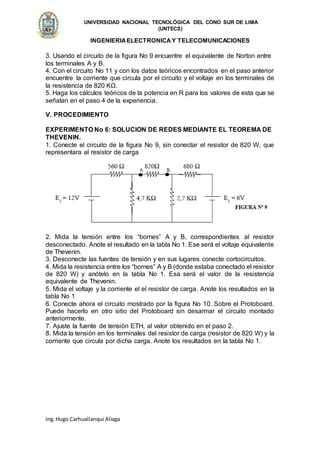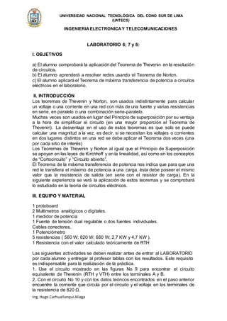 Este documento presenta los objetivos, equipos, procedimientos y tablas de resultados para tres experimentos de laboratorio sobre los teoremas de circuitos eléctricos de Thevenin, Norton y máxima transferencia de potencia. Los estudiantes aplicarán estos teoremas para simplificar circuitos, calcular voltajes, corrientes y potencia, y compararán sus cálculos con mediciones para verificar los conceptos teóricos.