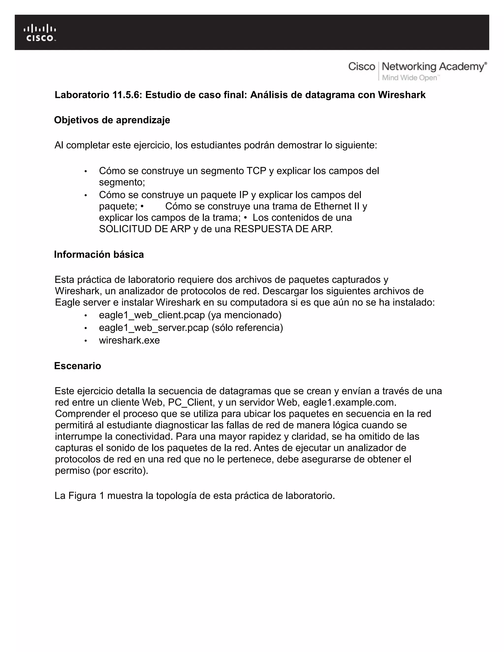 Este documento describe un estudio de caso para analizar paquetes de red utilizando Wireshark. Explica los pasos para preparar el laboratorio cargando archivos de captura y configurando Wireshark. Luego guía al usuario a través del análisis de la secuencia de paquetes capturados para entender cómo se construyen y envían los segmentos TCP, paquetes IP y tramas Ethernet durante una solicitud web entre un cliente y servidor. El usuario aprende sobre los campos y protocolos involucrados a cada nivel de la pila OSI a medida que se res