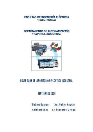 Este documento presenta 10 secciones sobre el laboratorio de control industrial. Cubre temas como los mandos básicos de un contactor, diseño de circuitos de control eléctrico usando contactores y relés, control de motores trifásicos mediante relés programables y PLC, y programación de PLC usando lenguaje SFC. El objetivo es familiarizar a los estudiantes con elementos de control eléctrico y su aplicación en circuitos y sistemas industriales.