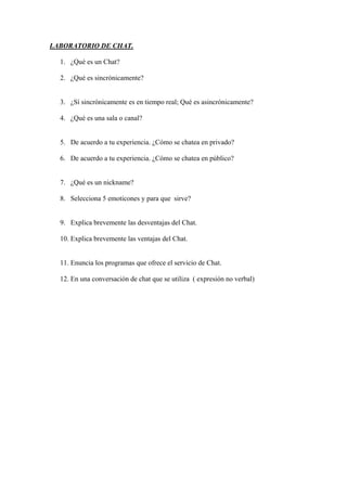 Este documento presenta preguntas sobre conceptos básicos relacionados con el chat como medio de comunicación en línea en tiempo real, incluyendo definiciones de chat síncrono y asíncrono, cómo chatear en privado y público, el uso de nicknames y emoticones, las ventajas y desventajas del chat, y programas y expresiones no verbales comunes en conversaciones por chat.
